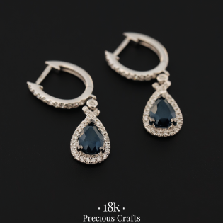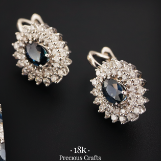 თეთრი ოქროს საყურე, ბრილიანტისა და საფირის თვლებით.
