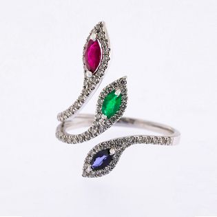 თეთრი ოქროს ბეჭედი 0,18 კარატი ბრილიანტის ზურმუხტისა და ლალის თვლებით