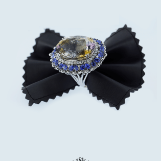 თეთრი ოქროს ბეჭედი 1,28 კარატი ბრილიანტის, საფირისა და ამეტრინი თვლებით